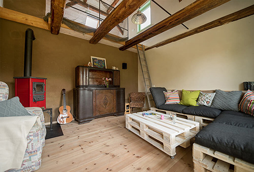 Innenbereich fast ausschließlich mit Lehm und Holz gebaut. Auch die vorhandene Einrichtung wurde aufgearbeitet und wiederverwendet.